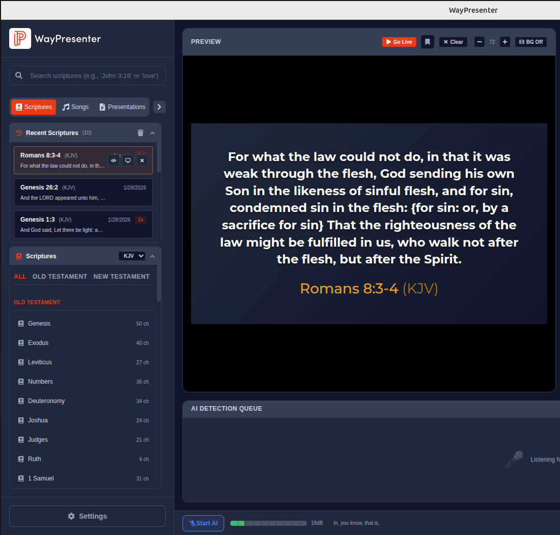WayPresenter offers multiple ways to display Bible scriptures during your services — from manual search to AI-powered automatic detection.